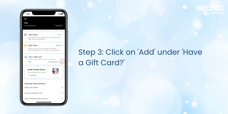 Type in your Ajio Gift Card details exactly as provided in your email or Woohoo account. Once applied, your balance will reflect instantly in your Ajio Wallet.