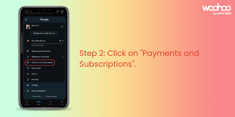 From the menu, select “Payments and Subscriptions.” This section lets you manage payment methods, subscriptions, and redeem codes.