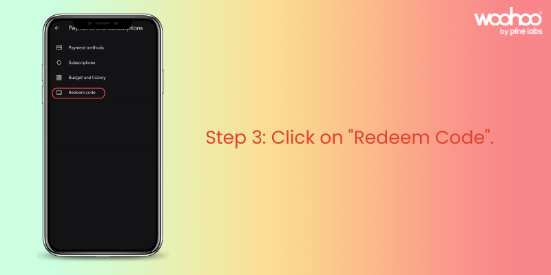 Inside “Payments and Subscriptions,” locate the “Redeem Code” option. Tap on it to proceed.