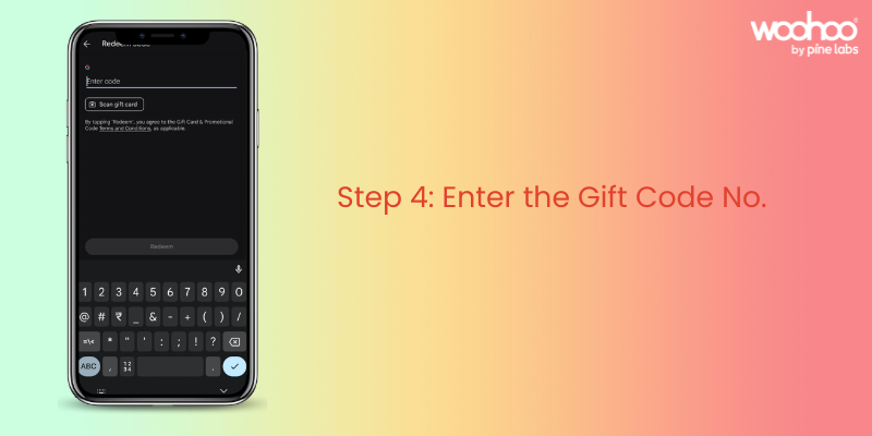 Type in the Google Play Gift Code exactly as shown in your email or Woohoo account. Once entered, tap “Redeem” to apply the balance to your account. Your Google Play balance will be updated instantly.